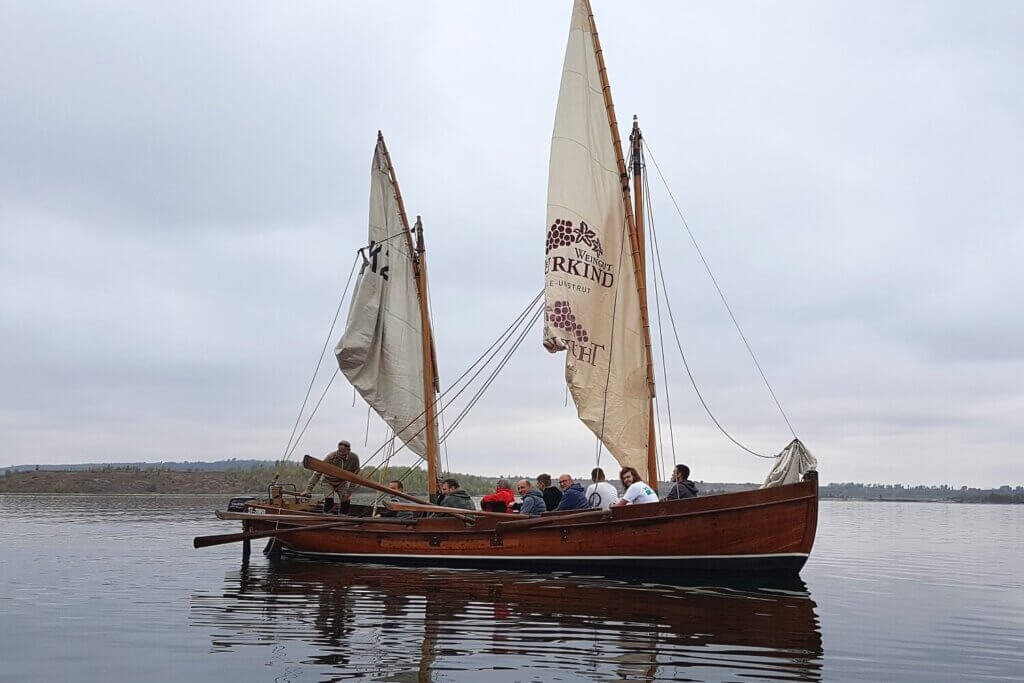 An Bord der Segler wurden die Füße naturgemäß weniger bewegt, dafür galt es, sich in die Ruder zu legen, denn leider wehte nur ein sehr laues Lüftchen, zu wenig, um die Boote allein durch Windkraft schnell und elegant durchs ruhige Wasser gleiten zu lassen. Doch wer braucht schon Segel, wenn er für jeden Matrosen und jede Matrosin ein Ruder an Bord hat? Mit vereinten Kräften schlug man der Flaute ein Schnippchen und steuerte das Nordufer des Geiseltalsees an. Dieser Bereich ist unerschlossen, man trifft nur auf Natur und jede Menge lautstark „schimpfende“ Wasservögel. Ein Paradies für Naturfreunde, Segler und Kanuten und sicherlich besonders schön im Frühling anzusehen. Für den Rückweg gönnte man sich Motorunterstützung und verzichtete auf den vielfach ungewohnten Rudersport.