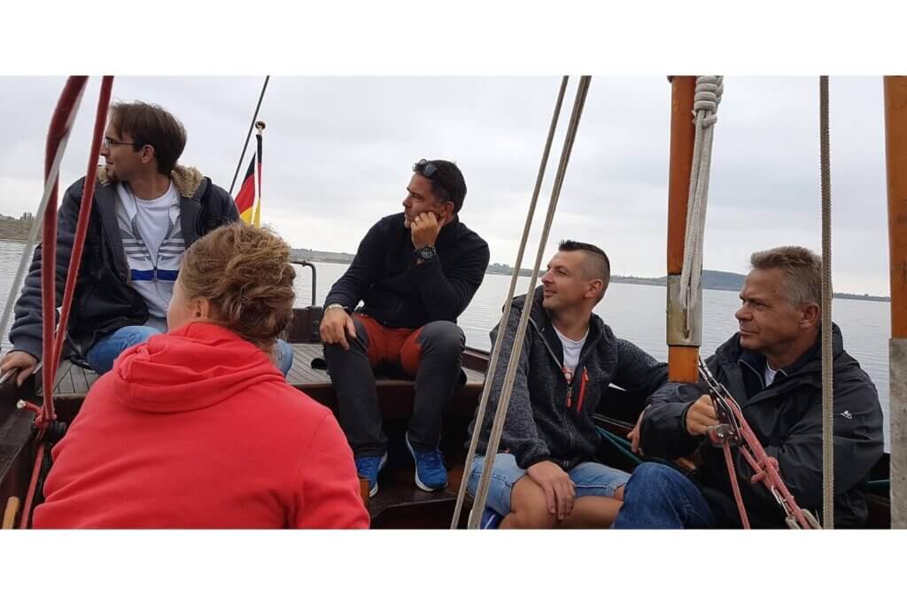 Vor der Tür wurden wir direkt von den Coaches der TEAMhelden in Empfang genommen. Die 99 Stufen zum Hafen absteigend, fand ich Gelegenheit für einige kurze Fragen an Eventprofi, Kommunikationstrainer und Trainings-Held Ralph Ellermann. Geboren aus nur einer kleinen Idee (Seifenkisten bauen und damit Teamrennen veranstalten), entwickelte sich die Nachfrage so rasant, dass man mittlerweile fest an drei Standorten, sowie bei Bedarf auch bundes- und schweizweit Veranstaltungen anbietet. Dabei wächst die Auswahl an spannenden, lustigen und stets sehr kommunikativen Möglichkeiten sich selbst und seine Kollegen ganz neu zu entdecken. Dank dieser Flexibilität kann man jedem Team das Passende bieten, egal, ob es sich um 1 oder 10 Dutzend Personen handelt. Perfekt für unser TEAMevent 2018.