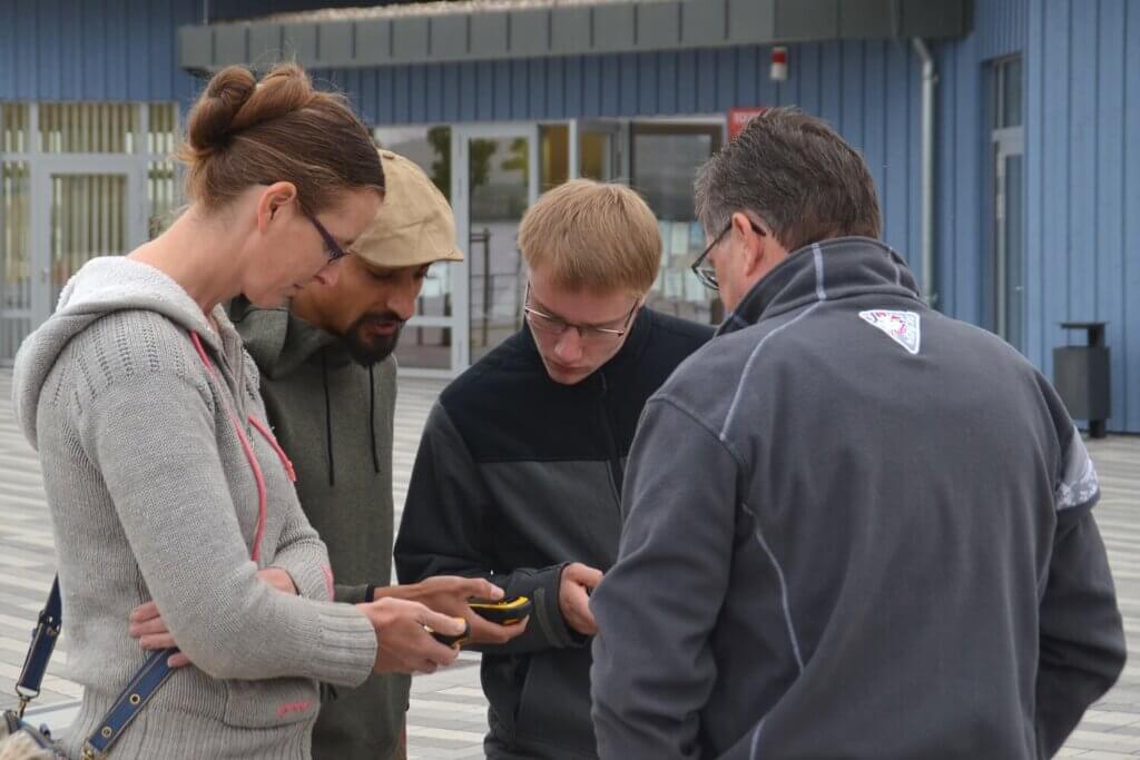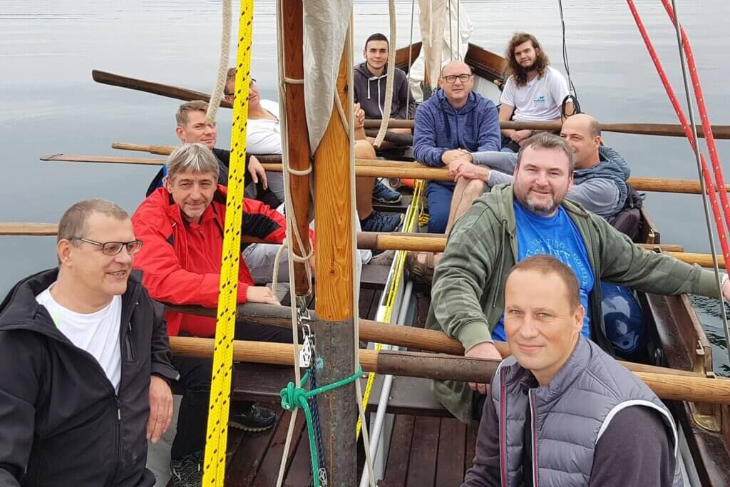 Wir hatten uns dazu entschieden, vormittags parallele Events durchzuführen, nachmittags dann alle gemeinsam etwas zu machen. Und so zog der Großteil von uns Richtung Mole davon, um nach einer kurzen Einweisung an Bord zweier bestens restaurierter 2-Mast-Segler zu klettern. Die „Landratten“ wurden nun ihrerseits in zwei Teams aufgeteilt und für die Geocaching-Rallye eingewiesen. Passend zur wasserreichen Örtlichkeit hatte diese einen sehr lustigen und „piratigen“ Ansatz. Warum sich selbst und den Tag zu bierernst nehmen? Wir erforschten also die Umgebung, mussten bestimmte Punkte finden und dort hinterlegte Aufgaben erfüllen, Goldschätze bergen, Leuchttürme bauen, eine Seebrücke stürmen, die Knotenkunde meistern, Piratenlieder üben, verflixte Rätsel lösen und Geheimnisse entdecken. Das Beste daran? Das Miteinander! Nur gemeinsam ließ sich in der vorgegebenen Zeit alles suchen, tun, bedenken, erfüllen. Und so viel sei verraten, wir hatten eine Menge Spaß dabei. Die beiden Damen aus den Geocaching-TEAMs durften die Siegprämien entgegennehmen, welche aus wohlschmeckenden und regionalen weinhaltigen Erzeugnissen bestanden. Und dabei dachten wir immer, Piraten trinken Rum..?