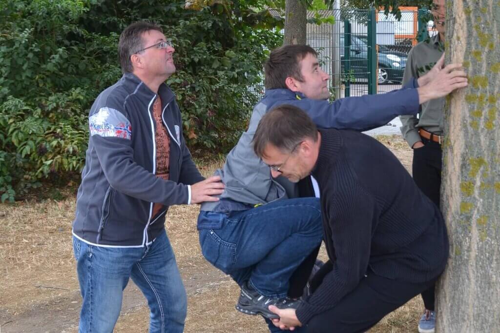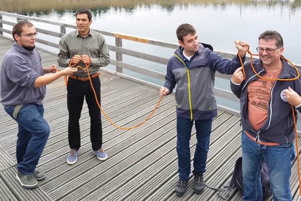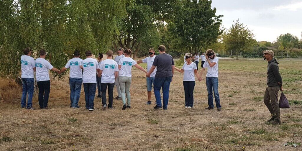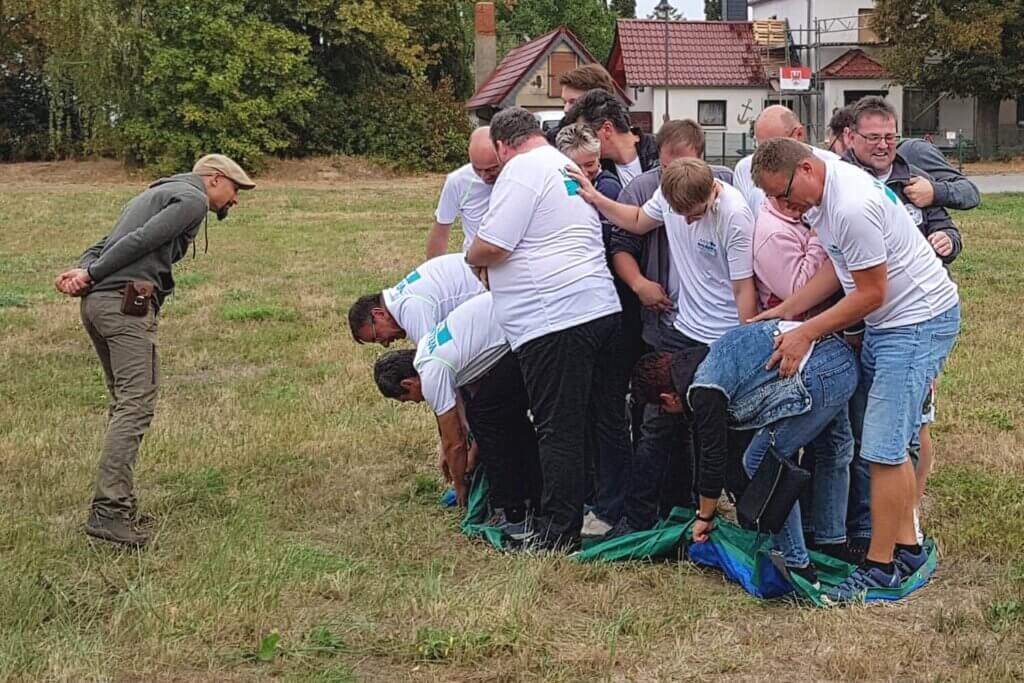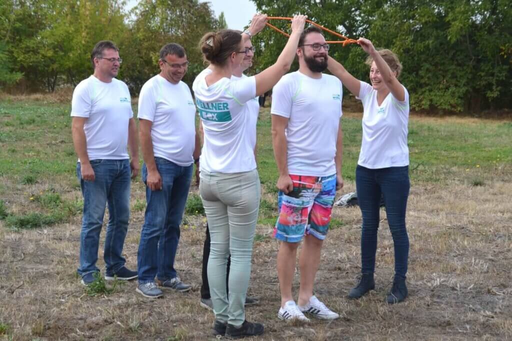 Für den Nachmittag war eine TEAM-Olympiade angesetzt und ehrlich gesagt, niemand konnte sich so recht vorstellen, was nun auf uns zukam. Erneut führten uns die Coaches der TEAMhelden zum Austragungsort, der aus einer momentan noch ziemlich gewöhnlichen und leeren Wiese bestand. Schnell und eindrucksvoll lernten wir aber, dass es bei einer TEAM-Olympiade keineswegs auf den Ort ankommt. Jedes der rund ein Dutzend Spiele mischte uns gehörig durcheinander, denn ständig fand man sich neben anderen Kollegen und in neuen Konstellationen zusammen, um sehr witzige, ungewöhnliche und „knobelige“ Spiele zu spielen. Was genau wir erlebten? Nun wir waren im wahrsten Sinne des Wortes sprachlos, blind und gefesselt. Und jeder, der dabei war, weiß genau, was ich damit meine.